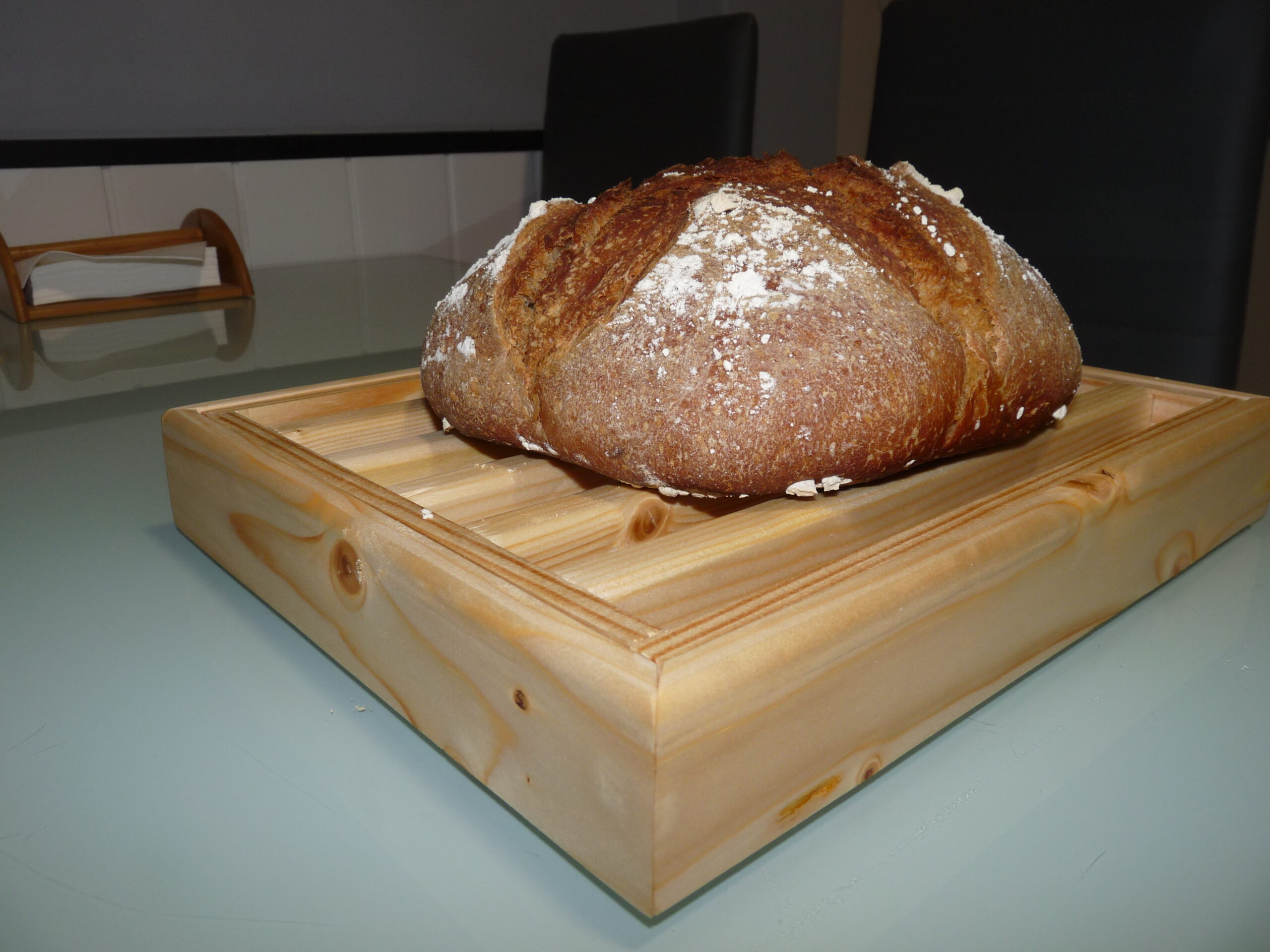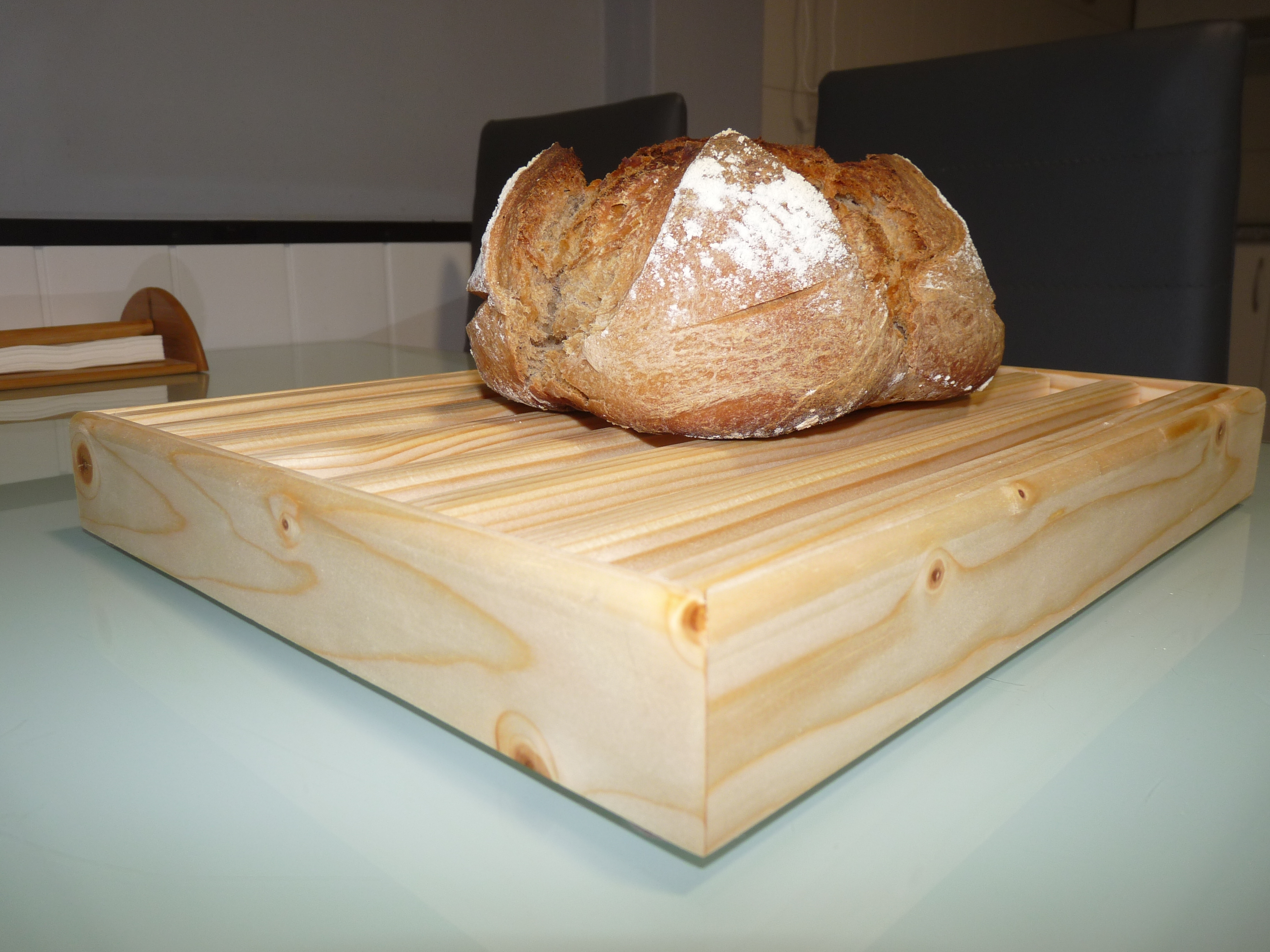 Tabla para cortar pan de mayor tamaño (30x35cm), hecha de madera de abeto y contrachapado para el fondo. Acabado final con aceite mineral de grado alimentario que garantiza que no se contaminen los alimentos. Fieltros en la base para proteger la superficie donde se apoye.